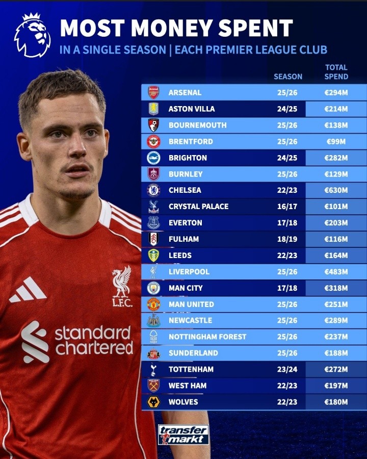 阿森纳、伯恩茅斯、布伦特福德、伯恩利、利物浦、曼联、纽卡、诺丁汉森林、桑德兰共9支球队都已创造了各自球队单赛季引援花费的历史纪录。